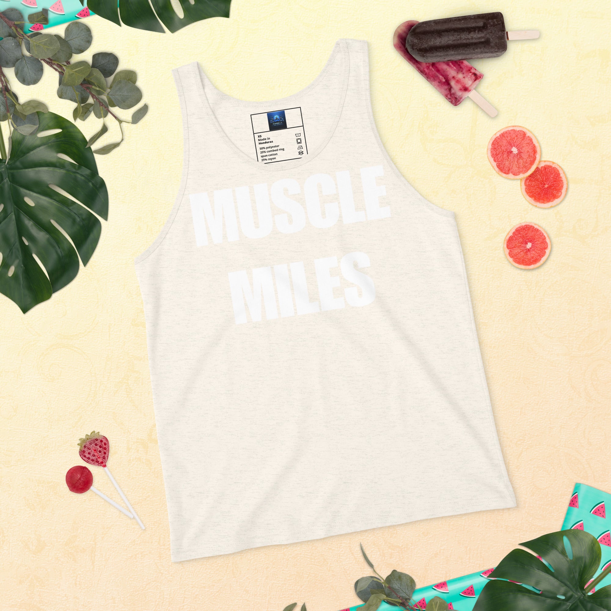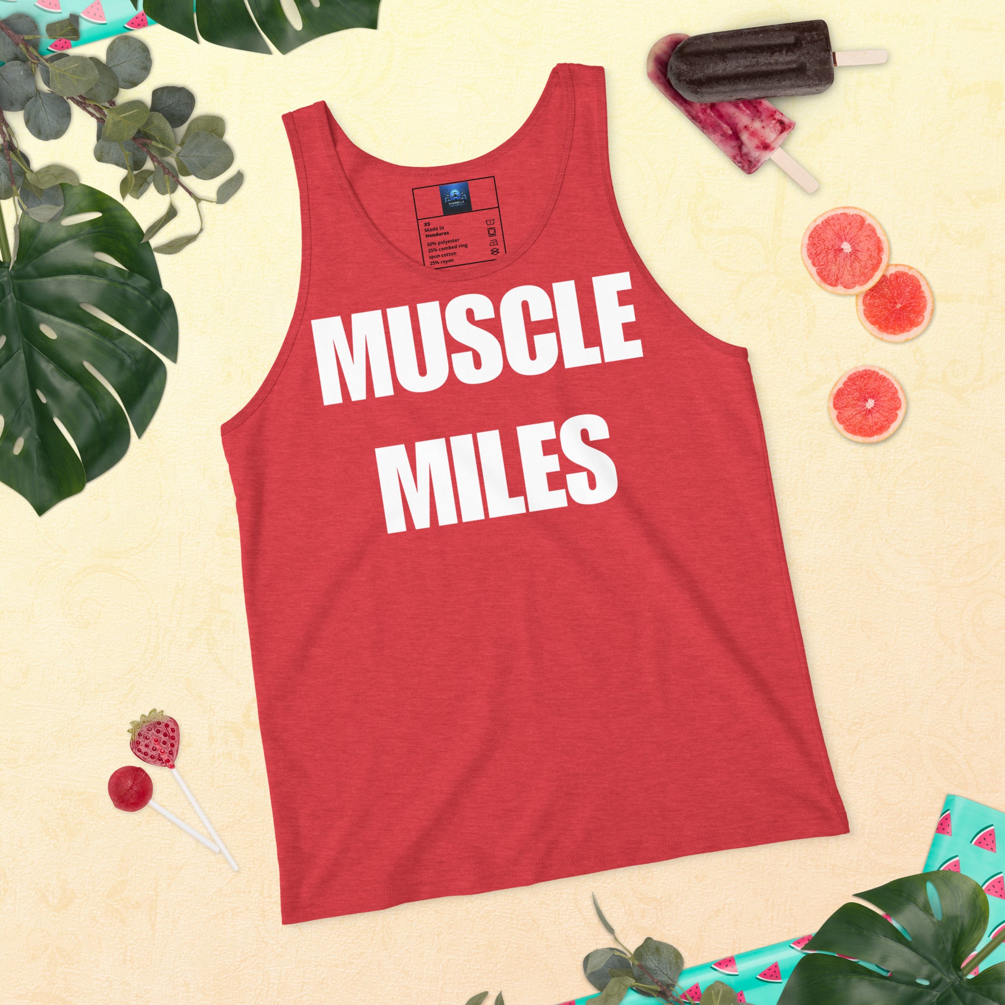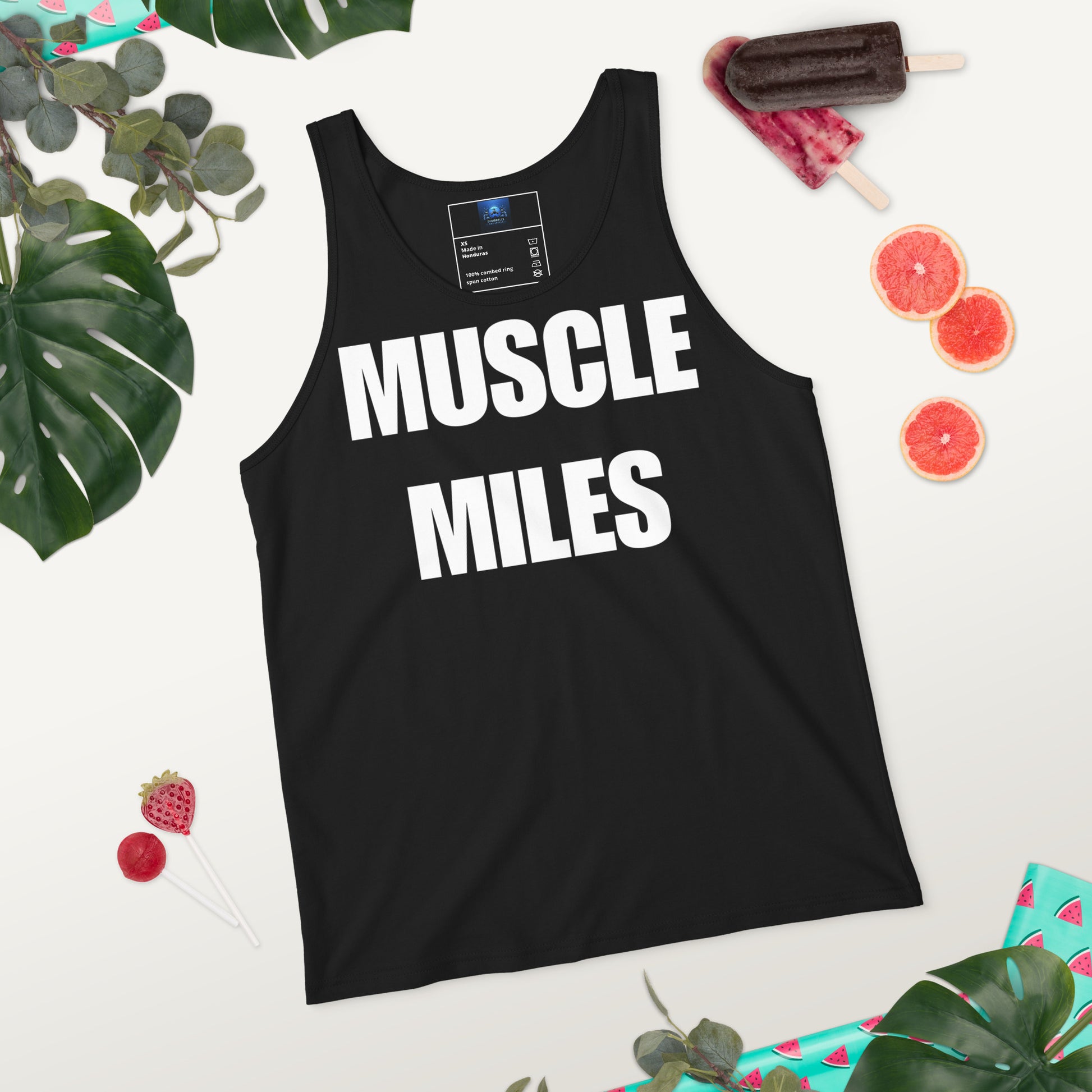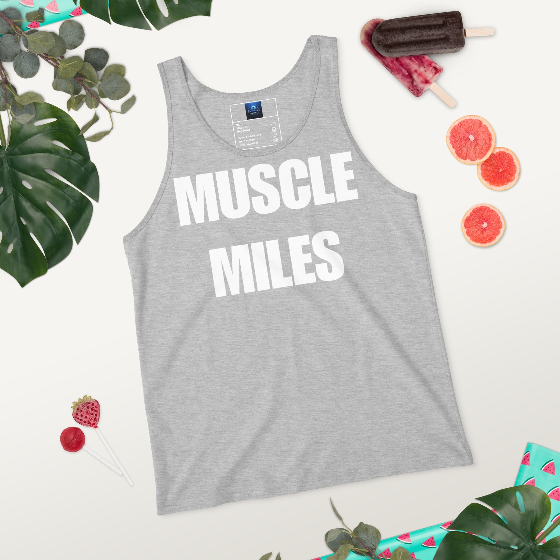 Add the Muscle Miles Men’s Tank Top to your collection and represent Dumbbells and Hotels wherever your journey takes you.