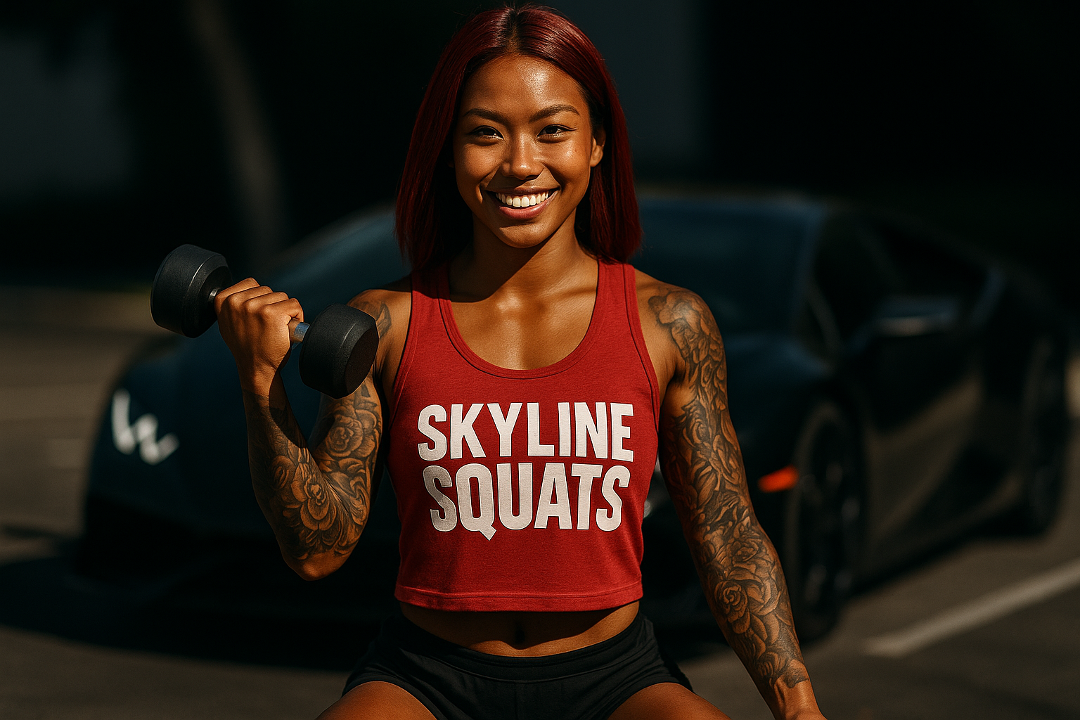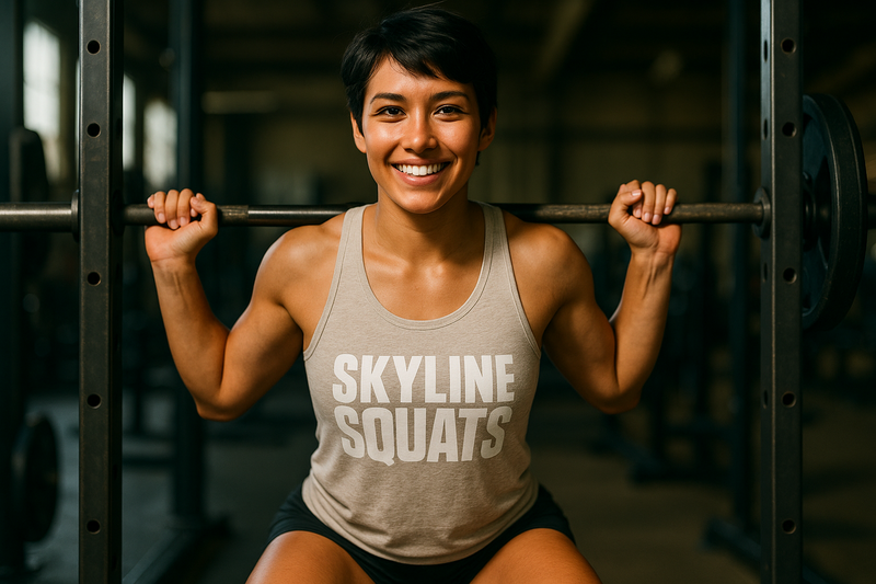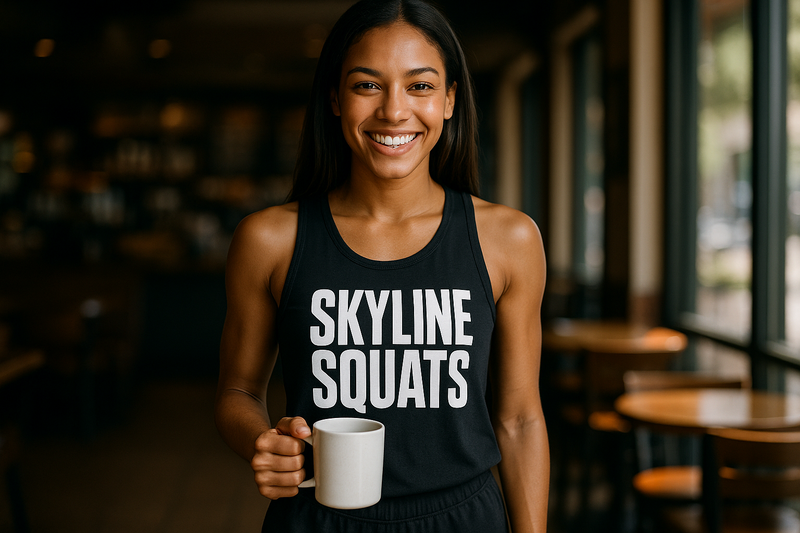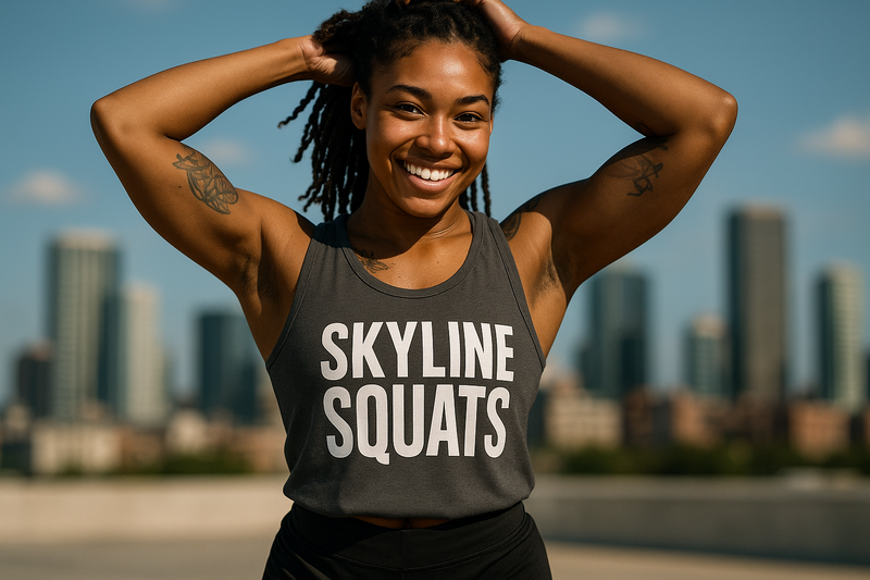 Add the Skyline Squats Men’s Tank Top to your workout wardrobe and represent Dumbbells and Hotels in style. Shop now and squat your way to success