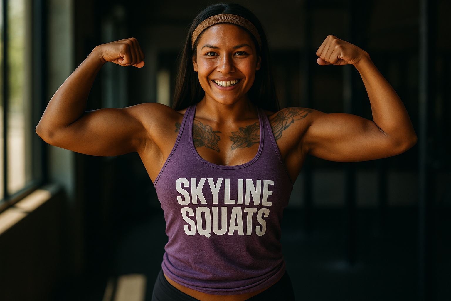 Add the Skyline Squats Women’s Racerback Tank to your wardrobe and represent Dumbbells and Hotels wherever your fitness journey takes you
