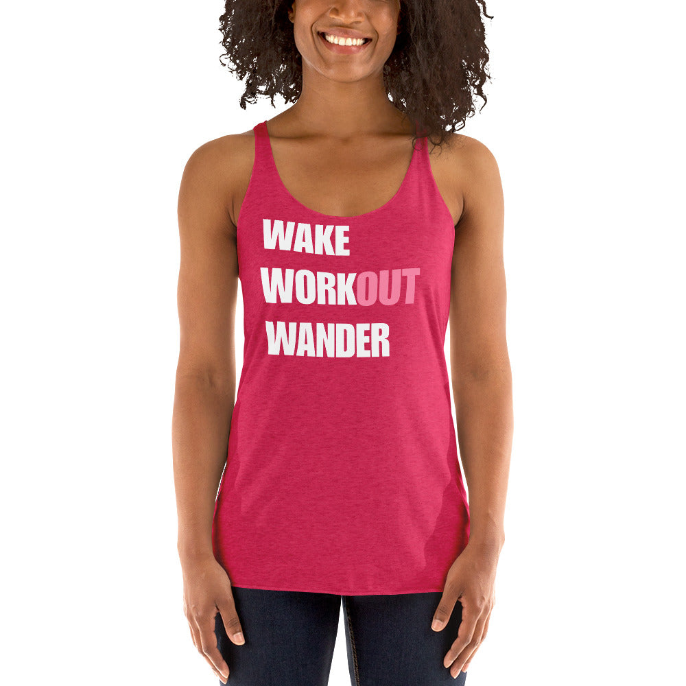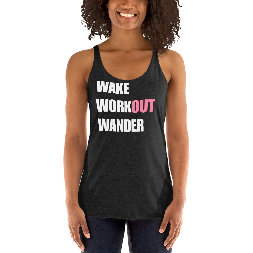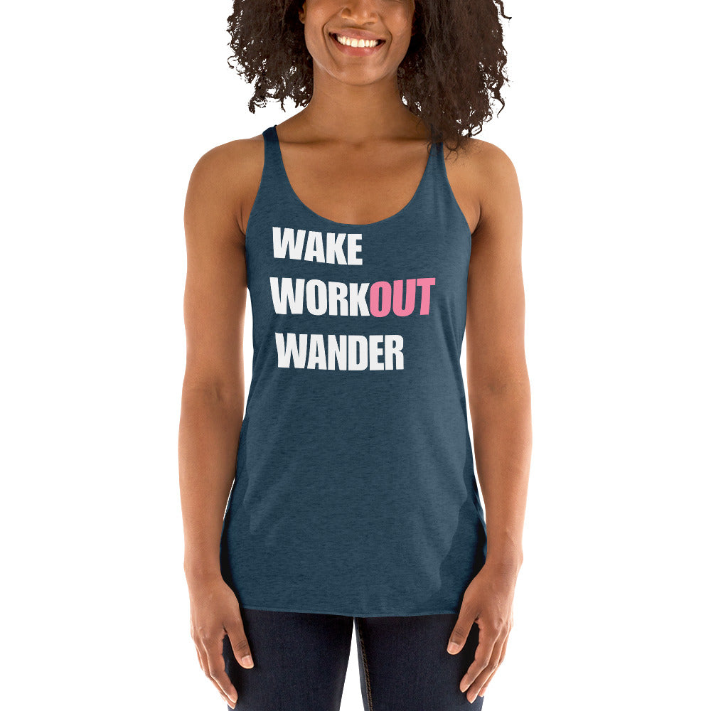 Fuel your fitness goals and showcase your adventurous spirit with the Wake Workout Wander Women’s Racerback Tank. Perfect for women who love to wake up, work out, and wander through life in style.